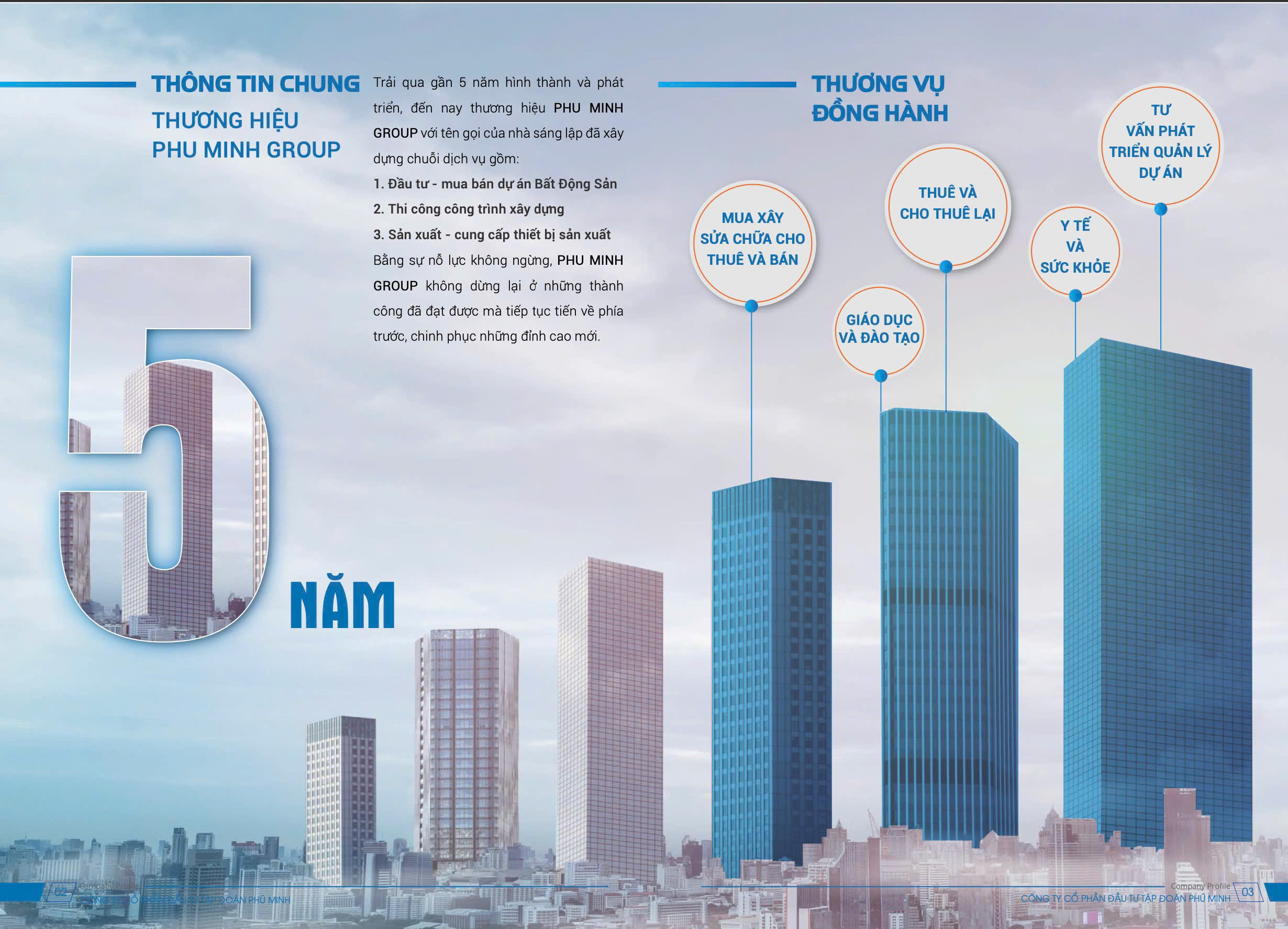 Phú Minh Group là doanh nghiệp bất động sản dòng tiền gồm mua bán, sửa chữa xây dựng dân dụng, cho thuê và bán, thiết bị công nghệ thông tin, thiết bị điện, điện tử. Mang lại giá trị sống vượt trội, đồng thời thúc đẩy sự phát triển của cộng đồng và thị trường. Hướng tới tư vấn, cung cấp giải pháp xây nhà trọn gói cho người dân trên 63 tỉnh thành, đồng thời phát triển thị trường, tìm kiếm khách hàng cho CNCT Viettel Hà Nội, kết hợp tư vấn về nhân sự và tư vấn dịch vụ phòng cháy chữa cháy…